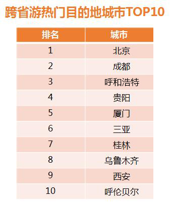 跨省游熱門目的地城市TOP10:北京、成都、呼和浩特、貴陽、廈門、三亞、桂林、烏魯木齊、西安、呼倫貝爾。