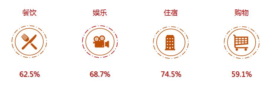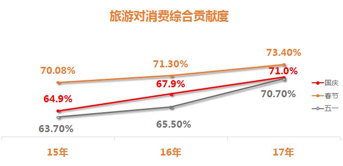 2017年國慶中秋假日旅游消費對餐飲、娛樂、住宿、購物四個行業(yè)的貢獻度均在5成以上。作為生活性服務(wù)業(yè)的重要組成部分,旅游消費為拉動相關(guān)行業(yè)經(jīng)濟做出了重要貢獻。