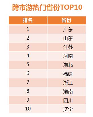 跨市游熱門省份TOP10:廣東、山東、江蘇、河南、湖北、福建、浙江、湖南、四川、遼寧。