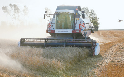 | 今年8月,在俄羅斯克拉斯諾亞爾斯克邊疆區(qū)的一個農(nóng)場,收割機在收割小麥。 |
