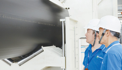 | 泉恩管業(yè)工作人員正在查看大口徑PE生產線激光噴碼作業(yè)。 |