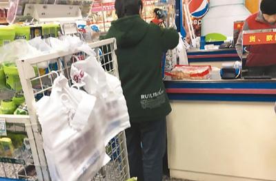 記者在北京市朝陽(yáng)區(qū)多家超市走訪時(shí)發(fā)現(xiàn),幾乎每家超市在收銀處都掛著型號(hào)不同的塑料袋,這些塑料袋小號(hào)每個(gè)0.2元、大號(hào)每個(gè)0.3元。由于食品選購(gòu)區(qū)的手撕式食品專用袋基本為免費(fèi)提供,因此幾乎每名顧客的購(gòu)物籃里都裝著五六個(gè)這樣的塑料袋。