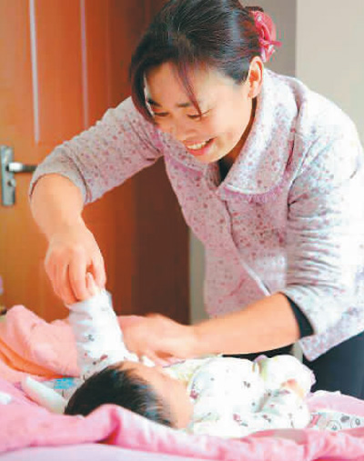 | 圖為張畢素在為新生小寶寶換衣服。 |