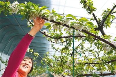 | 山東榮成市近年大力發(fā)展高效農業(yè)和生態(tài)扶貧產業(yè)項目,全市大櫻桃種植發(fā)展上千畝。3月7日,在榮成市石島管理區(qū)產業(yè)扶貧項目龍山湖生態(tài)采摘園一家櫻桃大棚里,果農正在給櫻桃樹壓枝疏花,鮮花深處乳果凸現。 |