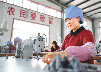 | 寧夏吳忠市同心縣河西鎮(zhèn)旱天嶺村村民在村里的“扶貧車間”參加服裝加工技能培訓(2017年12月21日攝)。這座新落成的“扶貧車間”可解決本村上百名建檔立卡貧困婦女的就業(yè)問題。 |