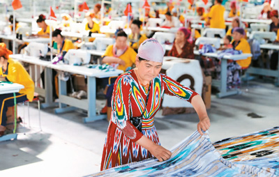 | 新疆喀什市乃則爾巴格鎮(zhèn)的海仁古麗·居瑪在鎮(zhèn)上婦女創(chuàng)業(yè)脫貧基地的縫紉企業(yè)里裁剪布料(二〇一七年六月三十日攝)。在廣東援疆資金支持建設下,乃則爾巴格鎮(zhèn)逐步成為更宜居宜業(yè)的美好家園。 |