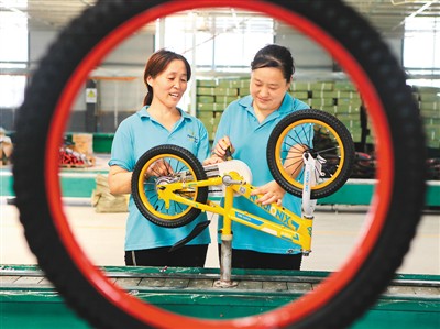 | 河北省邱縣鼓勵當地勞動密集型企業(yè)在農村建立“扶貧驛站”,幫助農村貧困群眾在家門口就業(yè)。圖為工人在邱縣一家自行車生產企業(yè)在該縣聶樓村設立的“扶貧驛站”內組裝自行車(2017年7月16日攝)。 |