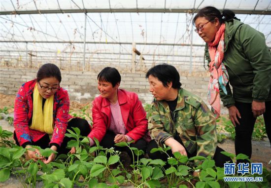 楊育英(左一)在自家果蔬大棚內與員工交流育苗技術(3月20日攝),F(xiàn)年45歲的楊育英早前并不從事農(nóng)業(yè)。她19歲開始到北京打工,先是做推銷員,后來專門從事設施農(nóng)業(yè)設備的生產(chǎn)?吹皆O施農(nóng)業(yè)前景廣闊,她2008年帶著技術和資金回到陜西渭南老家,搞起了葡萄種植。建大棚、配設施、引苗木,很快她就建起了渭南裕美現(xiàn)代農(nóng)業(yè)設施示范園,并先后引進了36個葡萄品種。問起成功的秘訣,她坦言得益于她的“朋友圈”。新華社發(fā)(張博文 攝)
