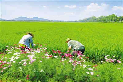 4月2日,博鰲國(guó)家農(nóng)業(yè)公園內(nèi),繁花盛開(kāi),水稻郁郁蔥蔥,農(nóng)戶(hù)在地里忙碌著。本報(bào)記者 袁琛 攝wRS安康新聞網(wǎng)