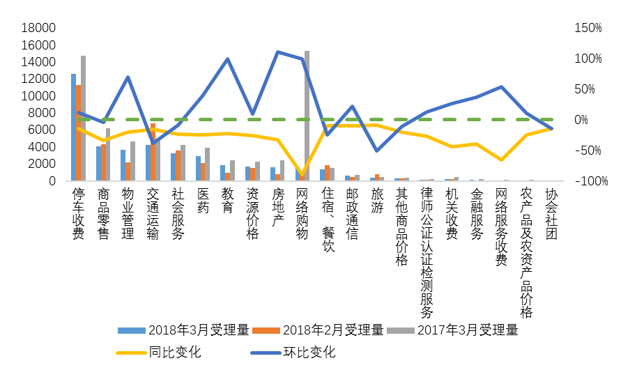 3月份平臺受理量排名前五的行業(yè)分別是停車收費(12615件)、交通運(yùn)輸(4216件)、商品零售(4100件)、物業(yè)管理(3674件)和社會服務(wù)(3259件)(見圖2)。與上月相比,交通運(yùn)輸、住宿餐飲和旅游等行業(yè)受理量下降明顯,物業(yè)管理、醫(yī)藥、教育、房地產(chǎn)、網(wǎng)絡(luò)購物、郵政通信和網(wǎng)絡(luò)服務(wù)收費受理量有所上升。與去年同期相比,各行業(yè)的舉報受理量均有所下降。2Yd安康新聞網(wǎng)