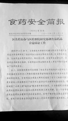 經(jīng)過努力,6個基層院共向當?shù)毓ど绦姓块T、食品藥品監(jiān)督管理部門發(fā)出檢察建議16件。沙坪壩區(qū)檢察院還與該區(qū)食藥監(jiān)分局會簽了《關于加強食品藥品領域公益訴訟工作協(xié)作的意見》,就公益訴訟案件線索移送、證據(jù)收集調查的協(xié)作、建立執(zhí)法聯(lián)席會議制度、訴前監(jiān)督程序以及提起公益訴訟工作等達成了一致意見。