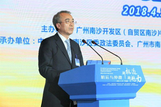 在“航運與仲裁 新機遇 新魅力”國際仲裁交流活動上,廣州市委常委、南沙區(qū)委書記蔡朝林致辭推介南沙。