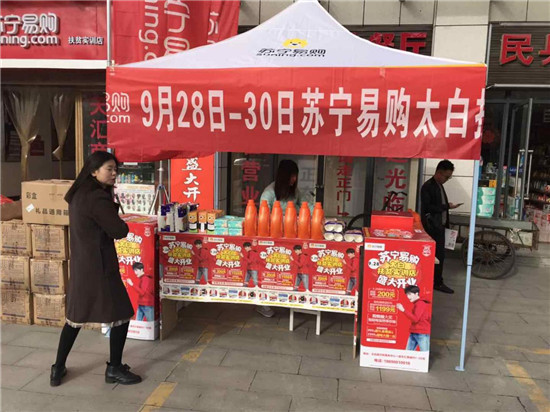 9月21日,蘇寧易購(gòu)電商扶貧實(shí)訓(xùn)店在陜西省寶雞市盛大開(kāi)業(yè),現(xiàn)場(chǎng)人頭攢動(dòng),場(chǎng)面火爆。太白店開(kāi)業(yè)3天,預(yù)計(jì)銷售30萬(wàn)元營(yíng)業(yè)額,預(yù)計(jì)全年銷售額300萬(wàn),預(yù)計(jì)全年盈利30萬(wàn),蘇寧將拿出盈利部分的70%的利潤(rùn),捐贈(zèng)給當(dāng)?shù)刈龃壬。如果?shí)訓(xùn)店虧損,由蘇寧全部承擔(dān)。