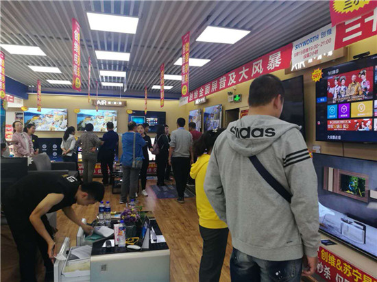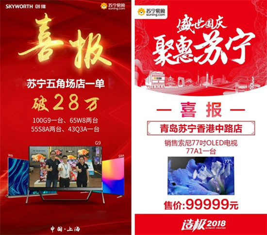 消費升級趨勢下,越來越多的消費者傾向于購買提升品質生活的家電產品。而彩電作為客廳娛樂的重頭戲,表現(xiàn)尤其明顯。代表未來顯示技術的OLED電視,QLED量子點電視在這個國慶,都受到了消費者的熱烈追捧。上海蘇寧五角廣場店開出了一筆超28萬元的彩電大單,客戶顧先生一口氣買下了188888元的創(chuàng)維百吋電視100G9、39999元的創(chuàng)維OLED電視65W8、11999元的創(chuàng)維OLED電視55S8A及創(chuàng)維43Q3A共計四臺電視。青島香港中路店則售出了售價99999元的索尼OLED電視77A1。
