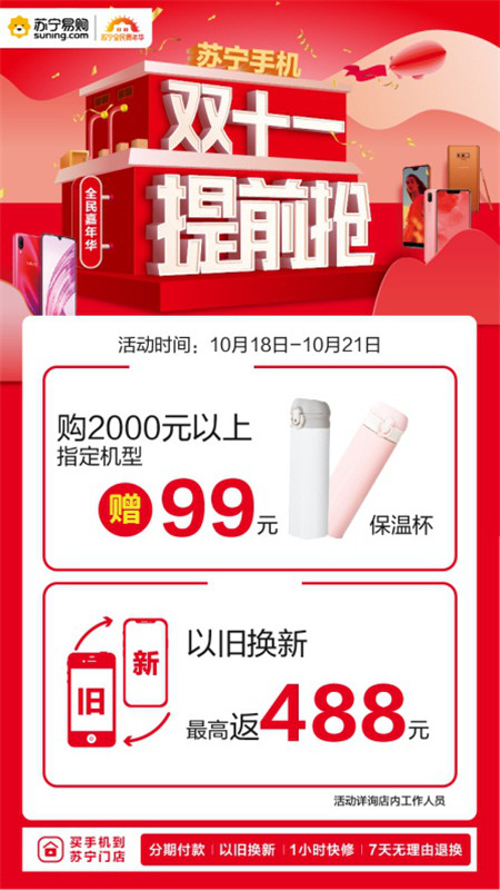 本次蘇寧手機(jī)“雙十一提前搶”活動(dòng),主要針對(duì)以舊換新業(yè)務(wù),活動(dòng)期間在蘇寧易購(gòu)門(mén)店通過(guò)以舊換新購(gòu)買(mǎi)新機(jī),最高可返488元,同時(shí)購(gòu)買(mǎi)2000元以上的指定機(jī)型,還可獲得獲贈(zèng)保溫杯等各種禮品。