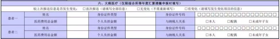 大病醫(yī)療一欄中,“醫(yī)藥費用總金額”需填寫社會醫(yī)療保險管理信息系統(tǒng)記錄的與基本醫(yī)保相關的醫(yī)藥費用總金額;個人負擔金額需填寫社會醫(yī)療保險管理信息系統(tǒng)記錄的基本醫(yī)保目錄范圍內扣除醫(yī)保報銷后的個人自付部分。