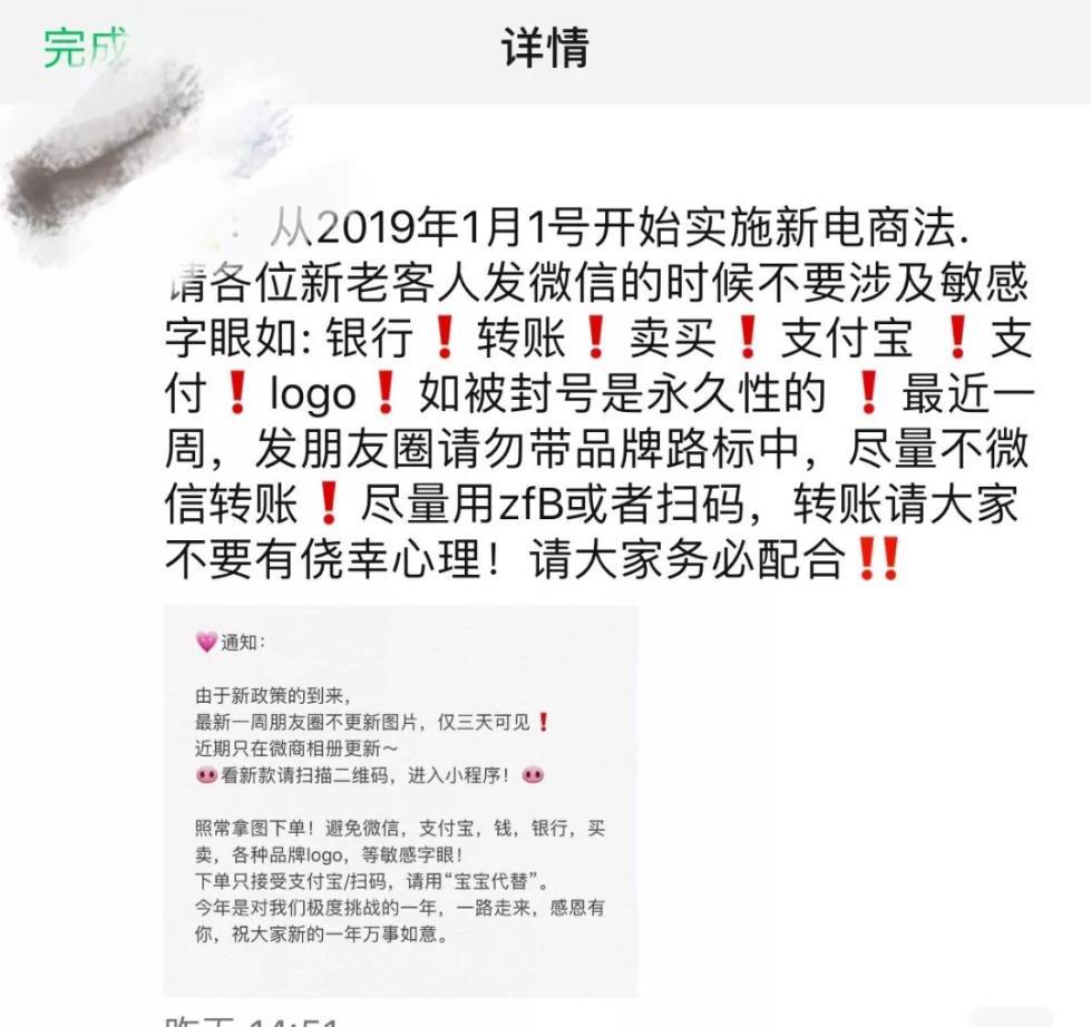 新《電商法》雖然沒有對微商、個人代購的監(jiān)管沒有出具體細(xì)則,代購圈內(nèi)卻已流傳了多個監(jiān)管措施版本,比如“敏感字眼交易雙方封號”、“不能微信直接付款”、“朋友圈限流和降權(quán)”等。