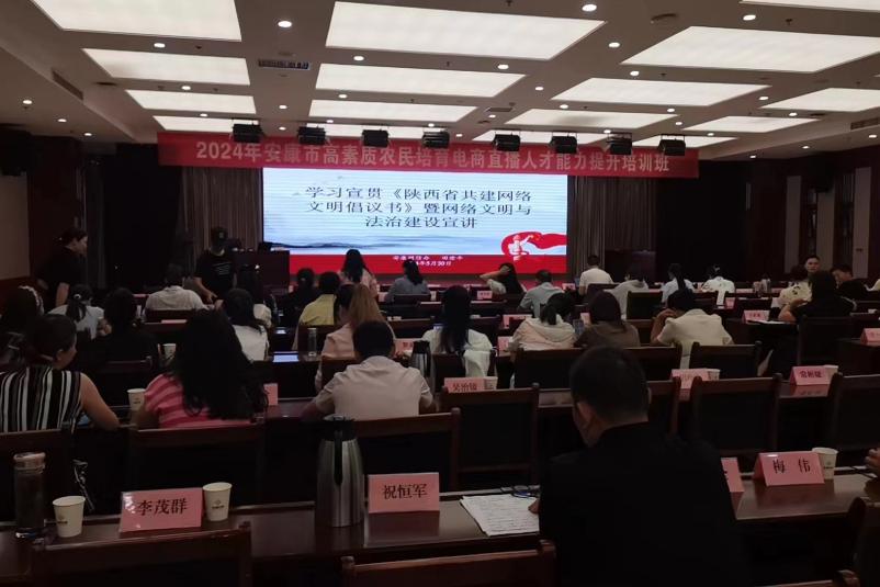 ? ? ? 5月28日,安康市高素質(zhì)農(nóng)民培育電商直播人才能力提升培訓(xùn)班如期開(kāi)班,市委網(wǎng)信辦參加活動(dòng)并就“踐行網(wǎng)絡(luò)文明 弘揚(yáng)網(wǎng)絡(luò)誠(chéng)信”做專題宣講培訓(xùn)。