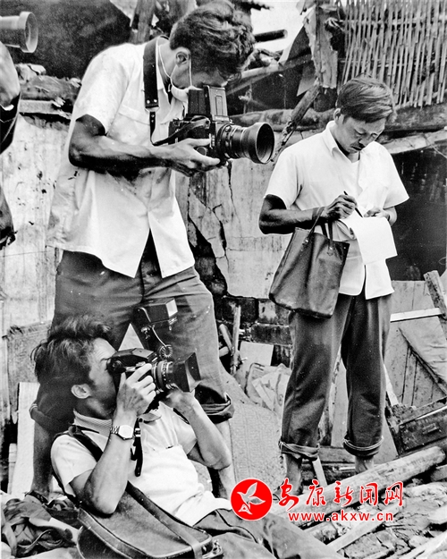 安康地區(qū)群藝館李西平(左一)當年拍攝的戰(zhàn)士手流鮮血待命的圖片獲“大眾攝影”年賽一等獎。地委宣傳部的宋選成(左三,已病逝)拍攝了倒塌前的邦克樓。陜西日報社胡武功(左四)的作品《當洪水襲來之際》獲得當年最佳新聞攝影獎。安康日報社記者張會鑒(左五,已病逝)正在采訪中。蘭州某部隊的王紅(右一)。Y4J安康新聞網(wǎng)