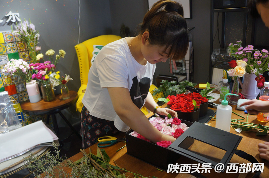 九零后花店的老板正在認(rèn)真插花。Hgv安康新聞網(wǎng)