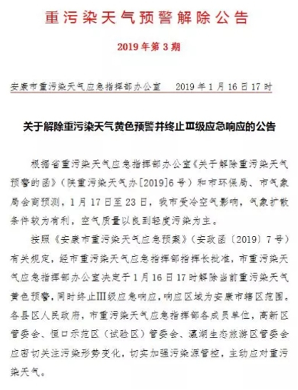 按照《安康市重污染天氣應(yīng)急預(yù)案》(安政函〔2019〕7號)有關(guān)規(guī)定,經(jīng)市重污染天氣應(yīng)急指揮部指揮長批準(zhǔn),市重污染天氣應(yīng)急指揮部辦公室決定于1月16日17時(shí)解除當(dāng)前重污染天氣黃色預(yù)警,同時(shí)終止Ⅲ級應(yīng)急響應(yīng),響應(yīng)區(qū)域?yàn)榘部凳休爡^(qū)范圍。各縣區(qū)人民政府,市重污染天氣應(yīng)急指揮部各成員單位,高新區(qū)管委會(huì)、恒口示范區(qū)(試驗(yàn)區(qū))管委會(huì)、瀛湖生態(tài)旅游區(qū)管委會(huì)應(yīng)密切關(guān)注污染形勢變化,切實(shí)加強(qiáng)污染源管控,主動(dòng)應(yīng)對重污染天氣。SPt安康新聞網(wǎng)