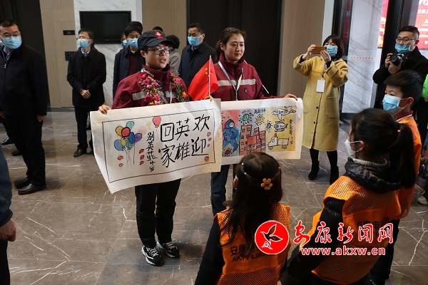 在高新國際會議中心大門入口的臺階上,三所市級醫(yī)院的醫(yī)護人員、市民群眾列起長隊,喊著口號,夾道歡迎英雄回家。進入大廳,孩子們紛紛獻上自己的畫作,表達對援鄂英雄的敬意。w4s安康新聞網(wǎng)