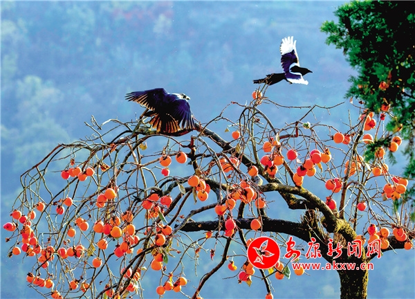 一次在漢濱區(qū)茨溝鎮(zhèn)西溝村拍鳥,當時正值秋收時節(jié),柿子樹上掛滿了熟透的柿子。張東風看到兩位農民在摘柿子,但是他們并沒有把樹上的柿子全部摘完,而是留了一些紅彤彤的柿子掛在樹上。TJ2安康新聞網(wǎng)