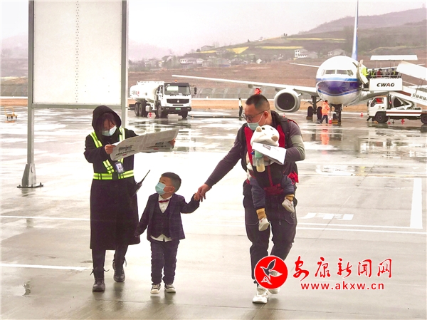 圖為安康機(jī)場(chǎng)工作人員在機(jī)坪為旅客服務(wù)