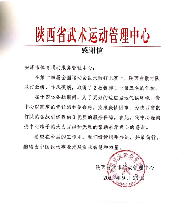 第十四屆全國(guó)運(yùn)動(dòng)會(huì)武術(shù)散打比賽圓滿結(jié)束,陜西省散打隊(duì)敢打敢拼、作風(fēng)硬朗,取得了2枚銀牌1個(gè)第五名的佳績(jī)。在十四運(yùn)備戰(zhàn)期間,我市克服疫情困難,為陜西省散打隊(duì)的備戰(zhàn)訓(xùn)練提供了優(yōu)質(zhì)的服務(wù)保障,讓隊(duì)員更好地適應(yīng)安康氣侯環(huán)境。感謝信中寫道:“希望在今后的工作中,繼續(xù)攜手共進(jìn),并肩前行,為中國(guó)武術(shù)事業(yè)發(fā)展貢獻(xiàn)智慧和力量。”