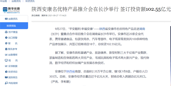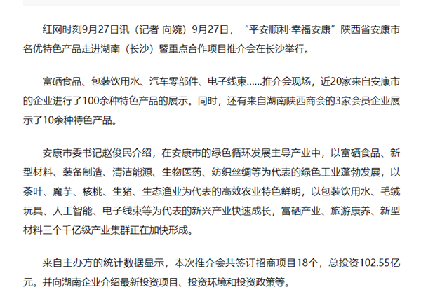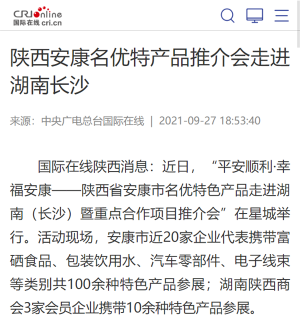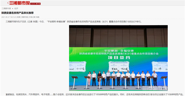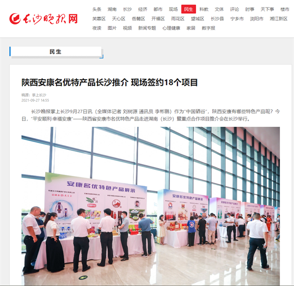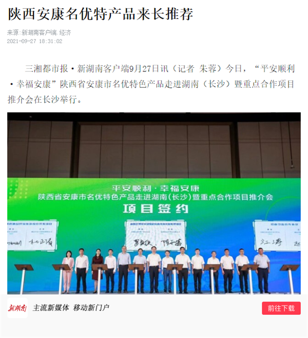 本網訊 9月27日,由中共安康市委、安康市人民政府,陜西省商務廳聯(lián)合主辦的“平安順利·幸福安康——陜西省安康市名優(yōu)特色產品走進湖南(長沙)暨重點合作項目推介會”在長沙市成功舉辦。新華社、中國交通廣播、中國報道、湖南日報、長沙晚報、三湘都市報、國際在線、紅網等中省、長沙以及駐長多家媒體紛紛給予報道。媒體不僅高度贊揚兩地的合作成果,并對安康有了一個嶄新的評價和認識。一起看看“老親戚”長沙眼中的“老鄰居”安康是什么樣!B2S安康新聞網