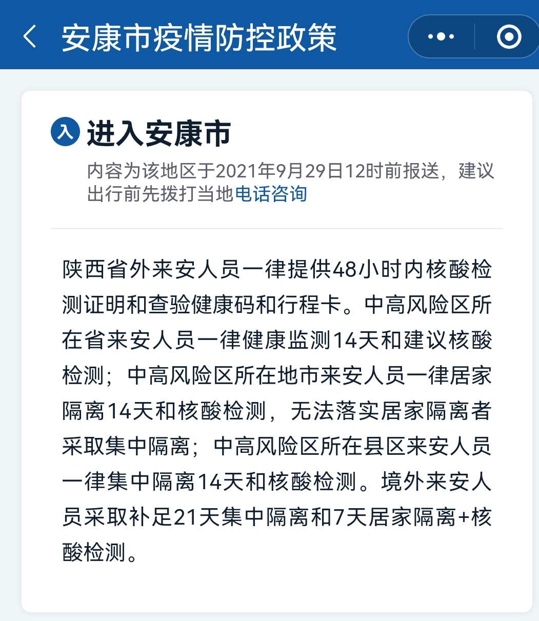 另據(jù)我市最新疫情防控措施要求,陜西省外來安人員,需提供48小時(shí)內(nèi)核酸檢測(cè)證明和查驗(yàn)健康碼和行程卡。中高風(fēng)險(xiǎn)區(qū)所在省來安人員,需要健康監(jiān)測(cè)14天并建議核酸檢測(cè);中高風(fēng)險(xiǎn)區(qū)所在地市來安人員,需居家隔離14天和核酸檢測(cè),無法落實(shí)居家隔離者將采取集中隔離;中高風(fēng)險(xiǎn)區(qū)所在縣區(qū)來安人員一律集中隔離14天和核酸檢測(cè)。境外來安人員采取補(bǔ)足21天集中隔離和7天居家隔離+核酸檢測(cè)。