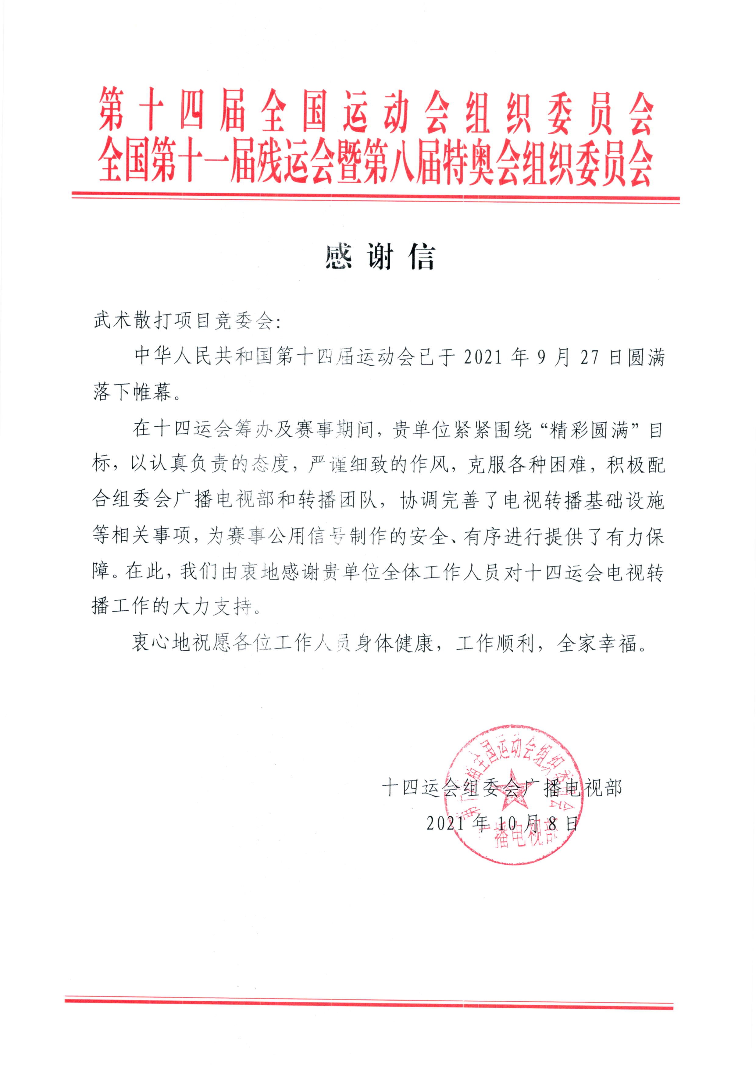 十四運會組委會廣播電視部在信中寫道:“緊緊圍繞‘精彩圓滿’目標,以認真負責的態(tài)度,嚴謹細致的作風,克服各種困難,積極配合組委會廣播電視部和轉(zhuǎn)播團隊,協(xié)調(diào)完善了電視轉(zhuǎn)播基礎(chǔ)設(shè)施等相關(guān)事項,為賽事公用信號制作的安全、有序提供了有力保障。”