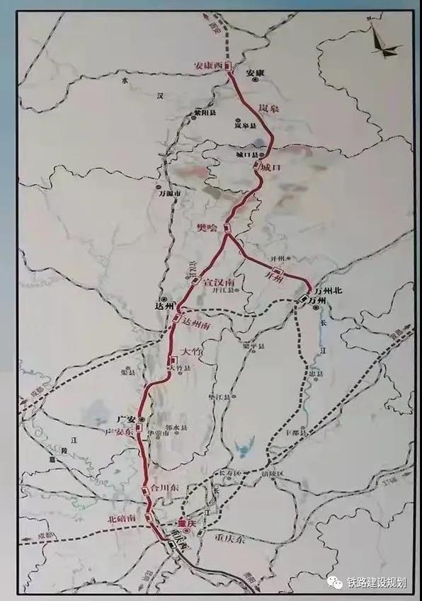 項目起自在建西安至安康高速鐵路安康西站,經(jīng)嵐皋、城口、宣漢、達州、大竹、廣安、合川、北碚,至重慶樞紐重慶西站,線路全長477.9公里(其中新建線路446.7公里),設(shè)11座車站;同步建設(shè)樊噲經(jīng)開州至萬州連接線,長90.2公里,設(shè)3座車站。配套新建本線至蘭渝鐵路、襄渝鐵路、成達萬高鐵聯(lián)絡(luò)線約26公里。