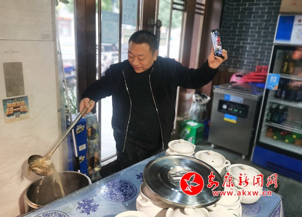 白天店內忙碌的時候,“70后”的梁存杰會舉著手機,記錄下食客排隊購買自家鹵豬蹄的畫面。到了傍晚,當?shù)陜鹊目土鬟_到頂峰時,后廚里忙碌的場景又成了他的視頻素材。他會在閑暇之余將這些拍攝的素材進行簡單剪輯后發(fā)布在自己的短視頻賬號上和朋友圈里,他的目的很簡單:“就是想讓大家都知道天源飯莊,在短視頻上介紹新菜,包括客戶的評價,都是為了吸引更多的顧客,做生意嘛,就是圖一個生意興隆!”