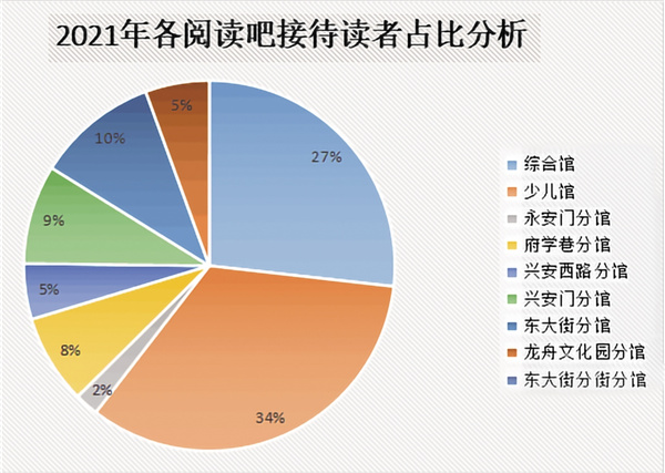 2021年,接待人數(shù)最多的閱讀場(chǎng)館也是少兒館,接待人數(shù)147188人次,占全年接待讀者總?cè)藬?shù)的34%。借閱排行榜的前20名均為少兒圖書(shū),其中楊紅櫻所著《笑貓日記·藍(lán)色的兔耳朵草》全年借閱次數(shù)達(dá)到97次。這表明,隨著雙減政策的落地和少兒閱讀積分存折、親子閱讀等少兒閱讀推廣活動(dòng)的開(kāi)展,極大地調(diào)動(dòng)了少兒群體的閱讀積極性,圖書(shū)館正逐漸成為學(xué)生群體課余生活的新選擇。
