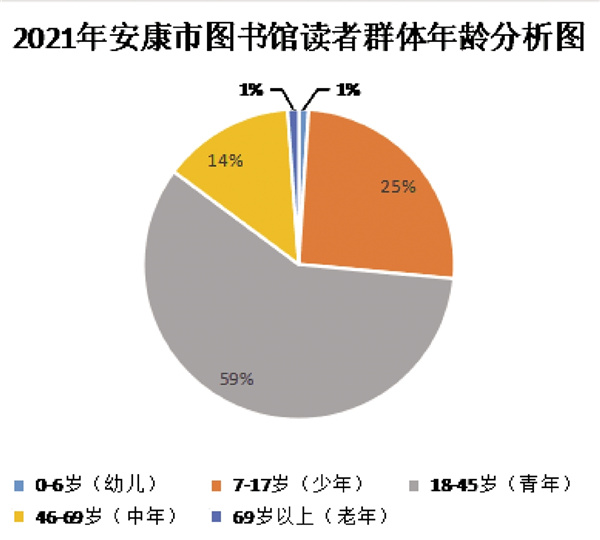 從讀者年齡段來(lái)看,市圖書(shū)館2021年有幼兒讀者(0-6歲)324人,少兒讀者(7-17歲)8098人,青年讀者(18-45歲)18686人,中年讀者(45-69歲)4347人,老年讀者(69歲以上)366人。讀者群體中青年讀者占比最大,占讀者群體的59%。少年讀者和青年讀者仍是圖書(shū)館的主要服務(wù)對(duì)象,總占比達(dá)到84%。