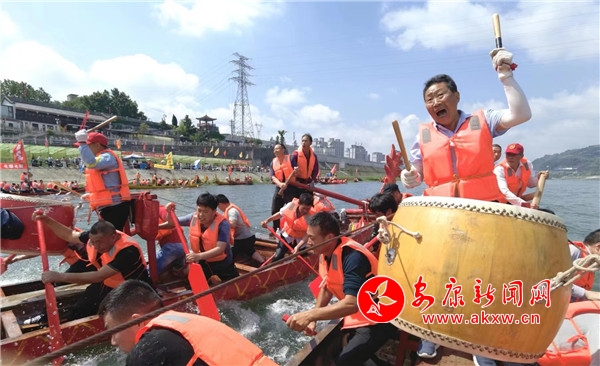 上午10時(shí)許,龍舟文化園禮炮轟鳴,數(shù)百健兒痛快地飲下“摔碗酒”,隨后依次登上自己隊(duì)伍的龍舟。紅色、黃色、紫色的龍舟整齊劃一地停靠在江邊,龍頭高昂,龍尾高翹,槳櫓浮動(dòng),旗幟飄揚(yáng)。聞聲而來(lái)的群眾齊聚兩岸,駐足圍觀?傊笓]一聲哨響,木槳齊動(dòng),龍舟似箭掠過(guò)無(wú)垠江面直逼江心,留下層層白浪;一艘艘或逆流勇進(jìn),或順流而下,或徑直橫渡,瞬間點(diǎn)燃觀眾激情,不時(shí)引得大家齊聲吶喊。號(hào)子聲、鑼鼓聲、吶喊聲、歡呼聲,此起彼伏,聲聲震天。隊(duì)員們跟隨著鼓點(diǎn)賣力地劃槳,舵手隨著龍舟行進(jìn)的方向不停調(diào)整把舵,龍舟的速度不斷加快,再快,更快。