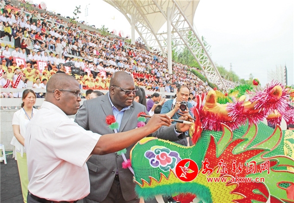 2016年,第十六屆安康龍舟節(jié)開幕式上,外國友人為龍頭點睛。 張喬 攝