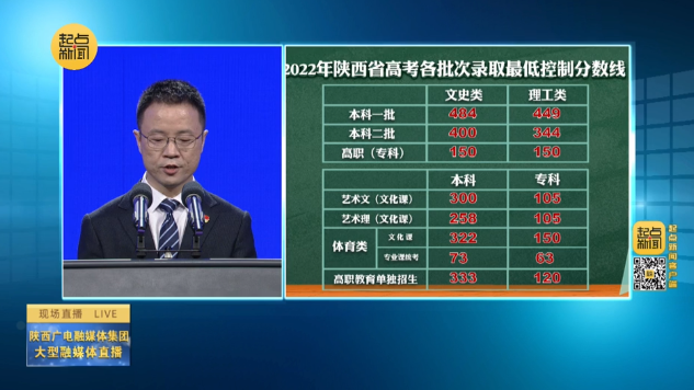 本網(wǎng)訊 6月24日,據(jù)2022年陜西省高考各批次錄取分?jǐn)?shù)線新聞發(fā)布會公布,陜西的理工類分?jǐn)?shù)線本科第一批為449分、第二批344分、?疲ǜ呗殻┡150分;文史類分?jǐn)?shù)線,本科一批484分、二批400分、專科(高職)批150分。
