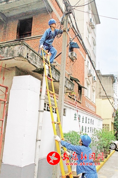 圖1、2、3:7月18日上午,在漢濱區(qū)大南街,國網(wǎng)安康供電公司漢濱供電分公司的工作人員正在對電網(wǎng)線路進行整治。 記者 張喬 攝