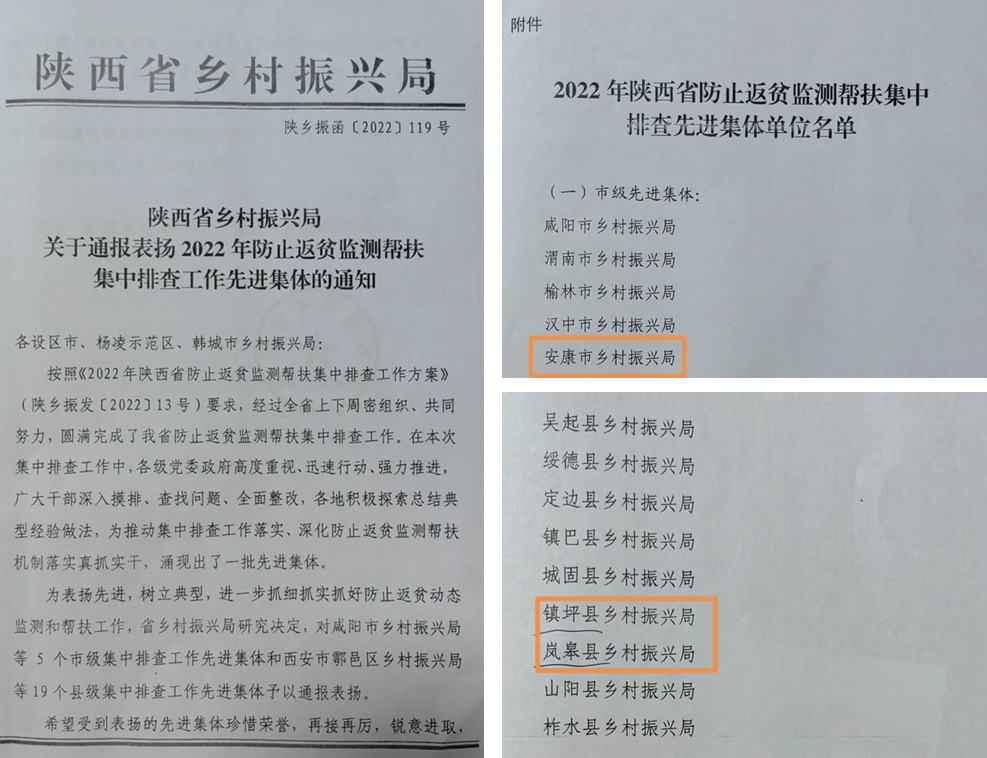 在8月5日陜西省鄉(xiāng)村振興局《關(guān)于通報(bào)表揚(yáng)2022年防止返貧監(jiān)測幫扶集中排查工作先進(jìn)集體的通知》中,我市鄉(xiāng)村振興局和嵐皋、鎮(zhèn)坪鄉(xiāng)村振興局獲得先進(jìn)集體的通報(bào)表揚(yáng)。