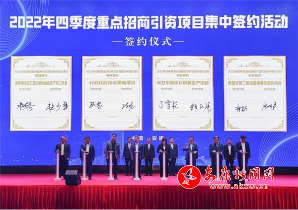 本網(wǎng)訊(記者 吳單)10月22日,安康高新區(qū)舉行2022年第四季度重點(diǎn)招商引資項(xiàng)目集中簽約活動(dòng)。市長王浩,市委常委、常務(wù)副市長高晶華,市委常委、安康高新區(qū)黨工委書記羅武俠出席活動(dòng)。