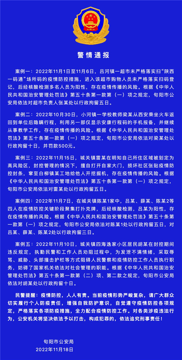 11月18日,旬陽市通報5起涉疫違法案件,依法處理8人
