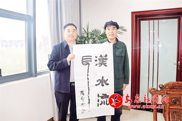 著名作家陳長吟(右)向恒口示范區(qū)捐贈書法作品。