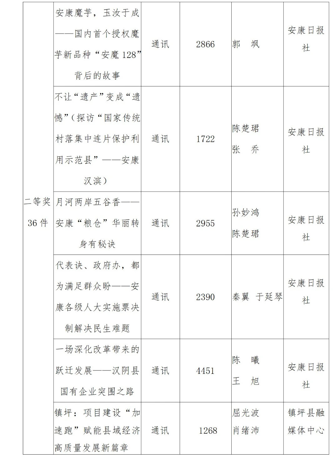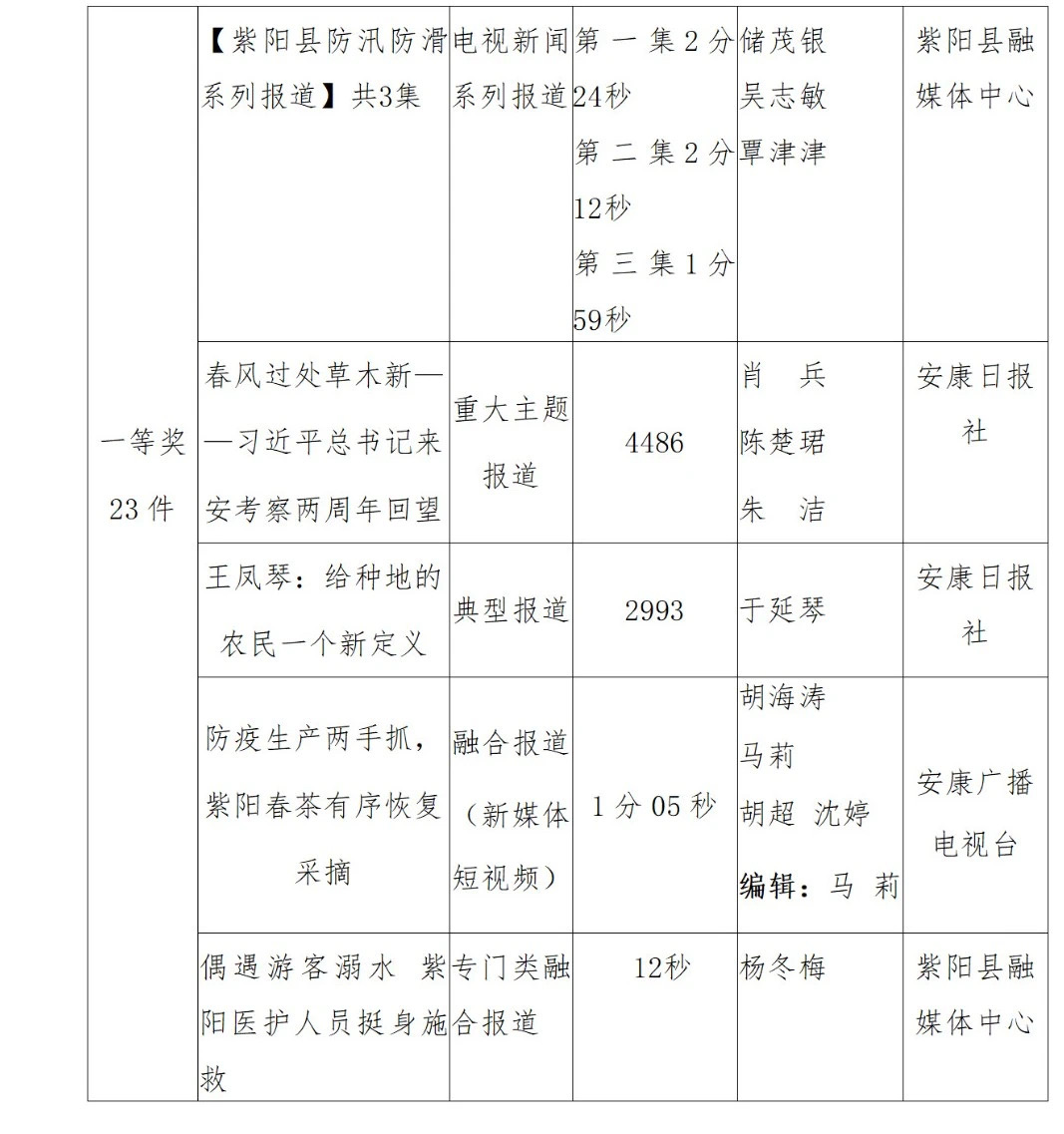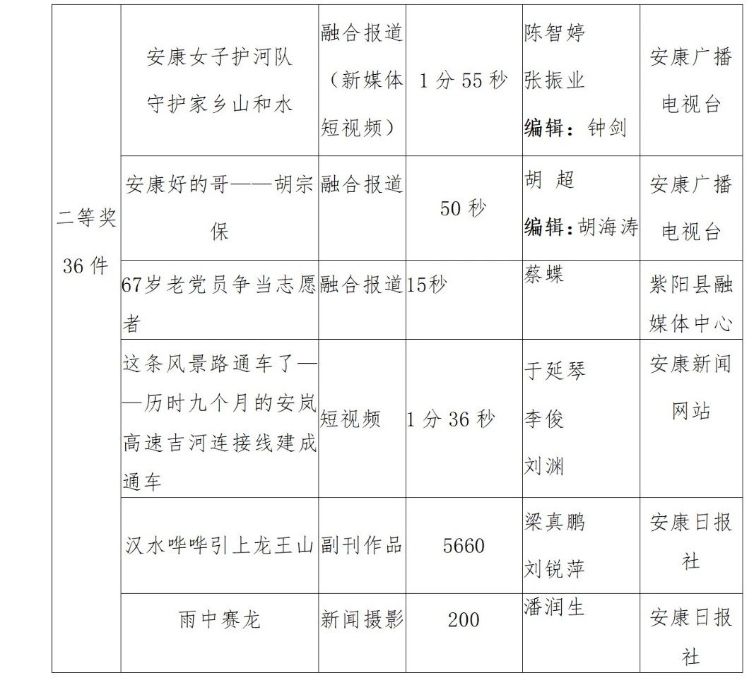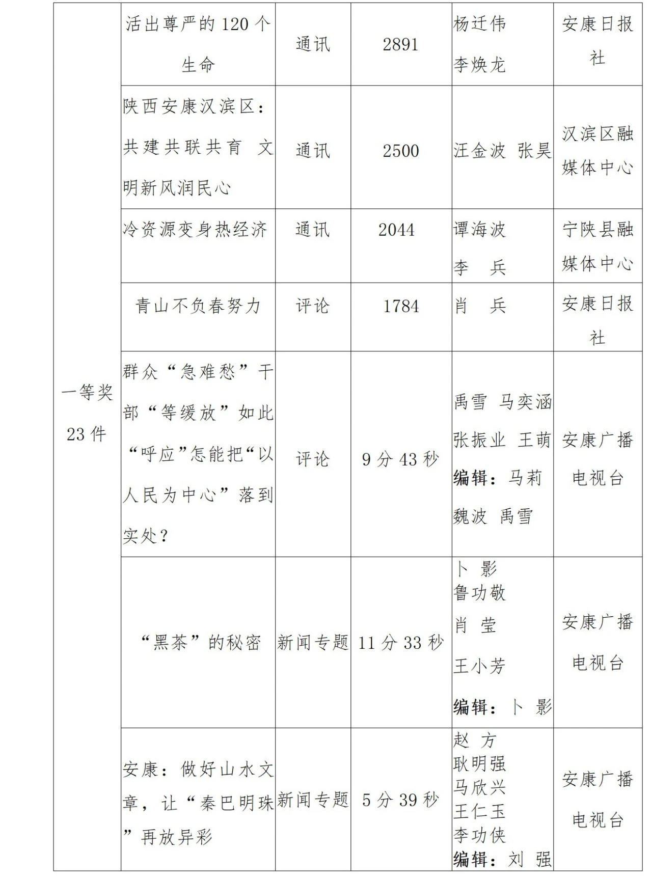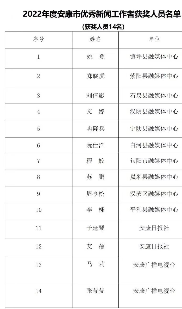 2022年度安康新聞獎評審工作在中共安康市委宣傳部的指導(dǎo)下,由市記協(xié)具體組織實(shí)施,經(jīng)過各申報(bào)單位推薦、初審,市記協(xié)復(fù)審并組織專家定評,評選出擬獲安康新聞獎作品96件,其中一等獎23件、二等獎36件、三等獎37件。擬授予姚登等14名同志“安康市優(yōu)秀新聞工作者”榮譽(yù)稱號。5ba安康新聞網(wǎng)