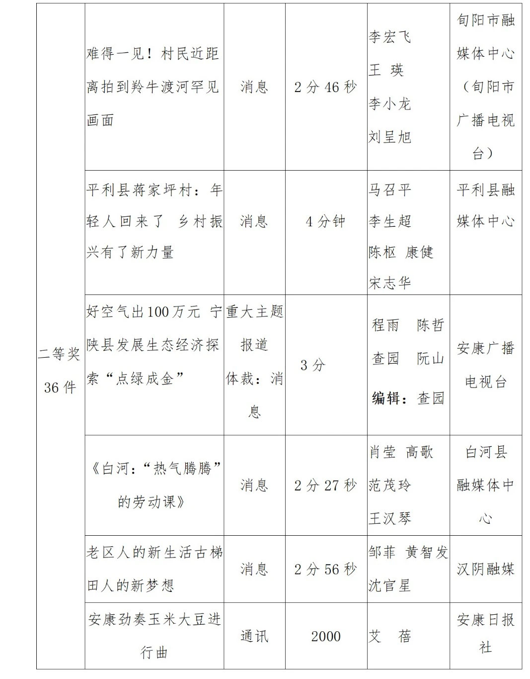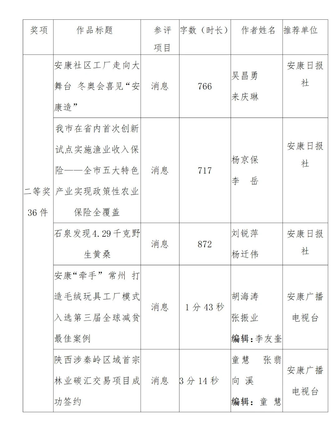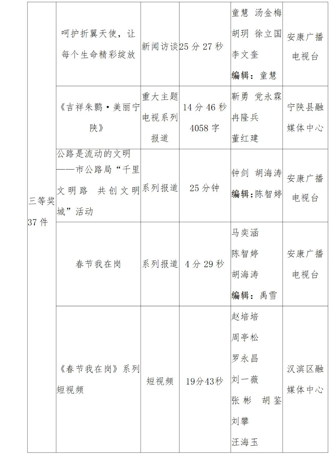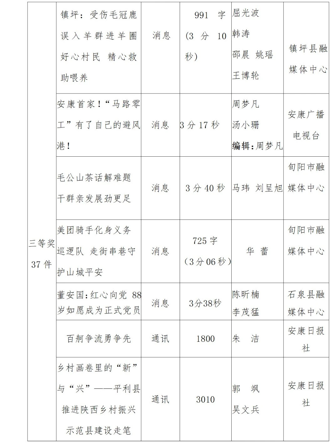2022年度安康新聞獎評審工作在中共安康市委宣傳部的指導(dǎo)下,由市記協(xié)具體組織實(shí)施,經(jīng)過各申報(bào)單位推薦、初審,市記協(xié)復(fù)審并組織專家定評,評選出擬獲安康新聞獎作品96件,其中一等獎23件、二等獎36件、三等獎37件。擬授予姚登等14名同志“安康市優(yōu)秀新聞工作者”榮譽(yù)稱號。5ba安康新聞網(wǎng)