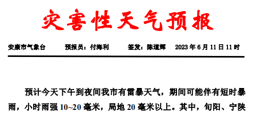 6月11日11時(shí),安康市氣象臺(tái)發(fā)布災(zāi)害性天氣預(yù)報(bào):