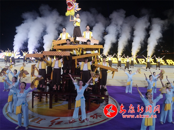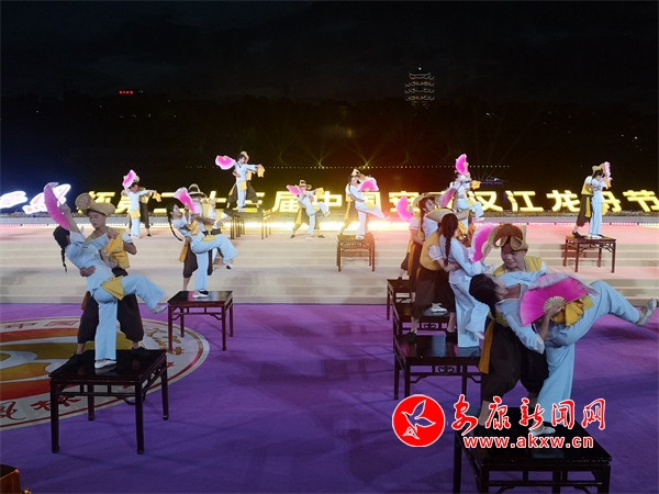 熠熠燈輝“靚”漢江,南北歌舞“響”安康。演出活動(dòng)以絢麗奪目的燈光秀《華彩漢江》開(kāi)場(chǎng),漢江兩岸五光十色的燈光隨著音樂(lè)的節(jié)律不斷變換、舞動(dòng),使一江兩岸美輪美奐,《安安康康鬧龍舟》通過(guò)“毛絨玩具”的親切問(wèn)候和載歌載舞,展現(xiàn)了安康新毛絨玩具產(chǎn)業(yè)蓬勃發(fā)展的動(dòng)力和生機(jī),具有地方特色的民族舞蹈《方寸之間》,將安康的傳統(tǒng)藝術(shù)與時(shí)代特色緊密結(jié)合,舞出了了安康人民在新時(shí)代表現(xiàn)出的新風(fēng)貌,原汁原味的陜南陜北民歌對(duì)唱,讓粗狂和婉約在漢水之濱進(jìn)行完美約會(huì),歌舞、獨(dú)唱、漢劇、雜技《南木有禾》《荷韻漢江》《節(jié)日歡歌》《魅力安康》《環(huán)之舞》《端午安康》等節(jié)目,以獨(dú)特的唱腔、曼妙的舞姿和獨(dú)特的技藝全方位的展現(xiàn)了漢水傳統(tǒng)文化的魅力和安康人民的精神追求,熱情激昂的歌舞《端午安康》演繹出了漢水兒女對(duì)聚力建設(shè)幸福安康的美好祝愿和對(duì)未來(lái)幸福美好生活的向往。