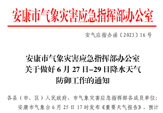 6月25日,安康市氣象災(zāi)害應(yīng)急指揮部辦公室發(fā)布《關(guān)于做好6月27日—29日降水天氣防御工作的通知》。Mn2安康新聞網(wǎng)