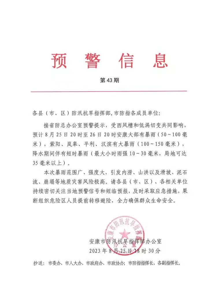 8月25日18時(shí)30分,市防汛抗旱指揮部發(fā)布預(yù)警信息:受西風(fēng)槽和低渦切變共同影響,預(yù)計(jì)8月25日20時(shí)至26日20時(shí)安康大部有暴雨(50—100毫米),紫陽、嵐皋、平利、漢濱有大暴雨(100~150毫米),降水期間伴有短時(shí)暴雨(最大小時(shí)雨強(qiáng)10—30毫米,局地可達(dá)35毫米以上)。